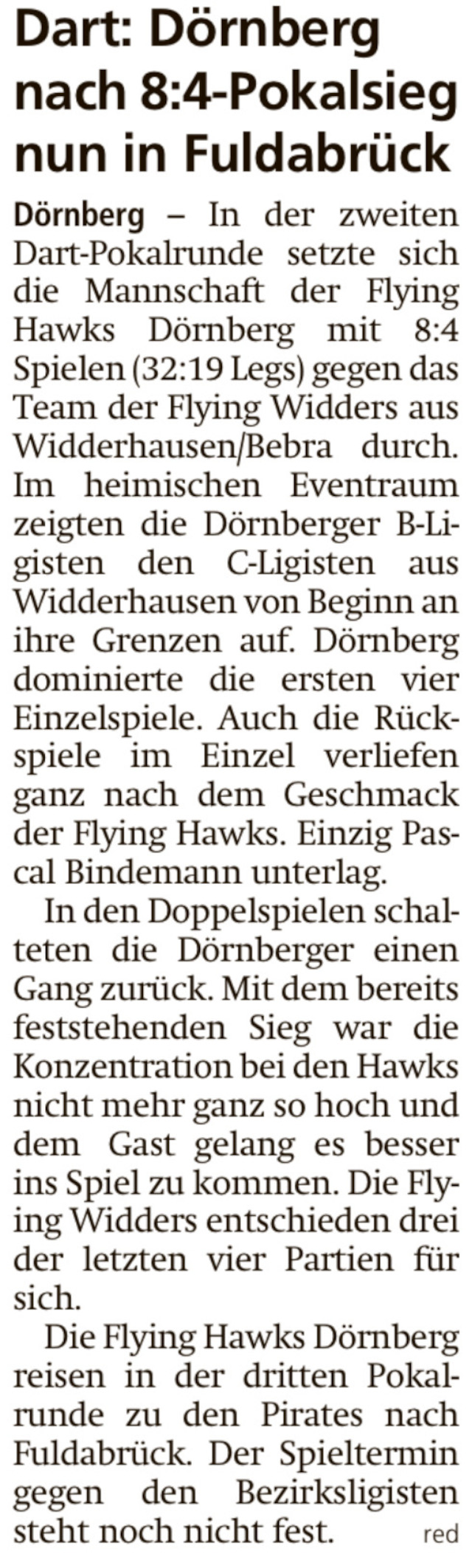 In der zweiten Pokalrunde der nordhessischen Dartliga setzte sich die Mannschaft der Flyining Hawks Dörnberg 1 mit 8:4 Spielen (32:19 Legs) gegen das Team der Flying Widders aus Widderhausen/Bebra durch.