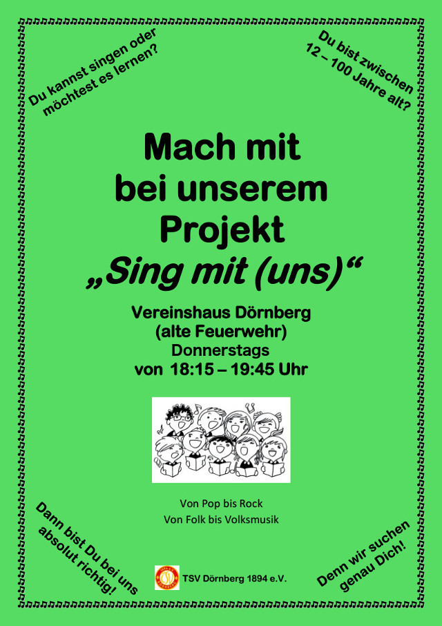 Das erste Treffen zum Kennenlernen und Proben findet am Donnerstag, den 2.November 2017, von 18:15 – 19:45 Uhr, im Vereinshaus, Grüne Aue, in Dörnberg statt.